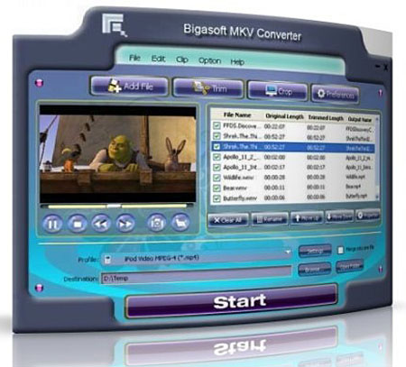 Bigasoft MKV Converter - конвертер MKV, MKА аудио и видео форматов в другие аудио и видео форматы, поддержка AVI, DivX, Xvid, WMV, MP4, H.264, MOV, HD и других форматов, извлечение аудио из видео в MKA, , WAV, WMA, AAC аудио форматы, поддержка iPod, iPhone ...