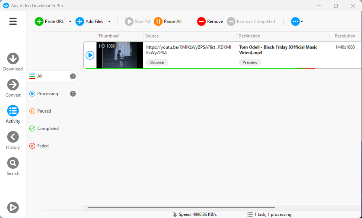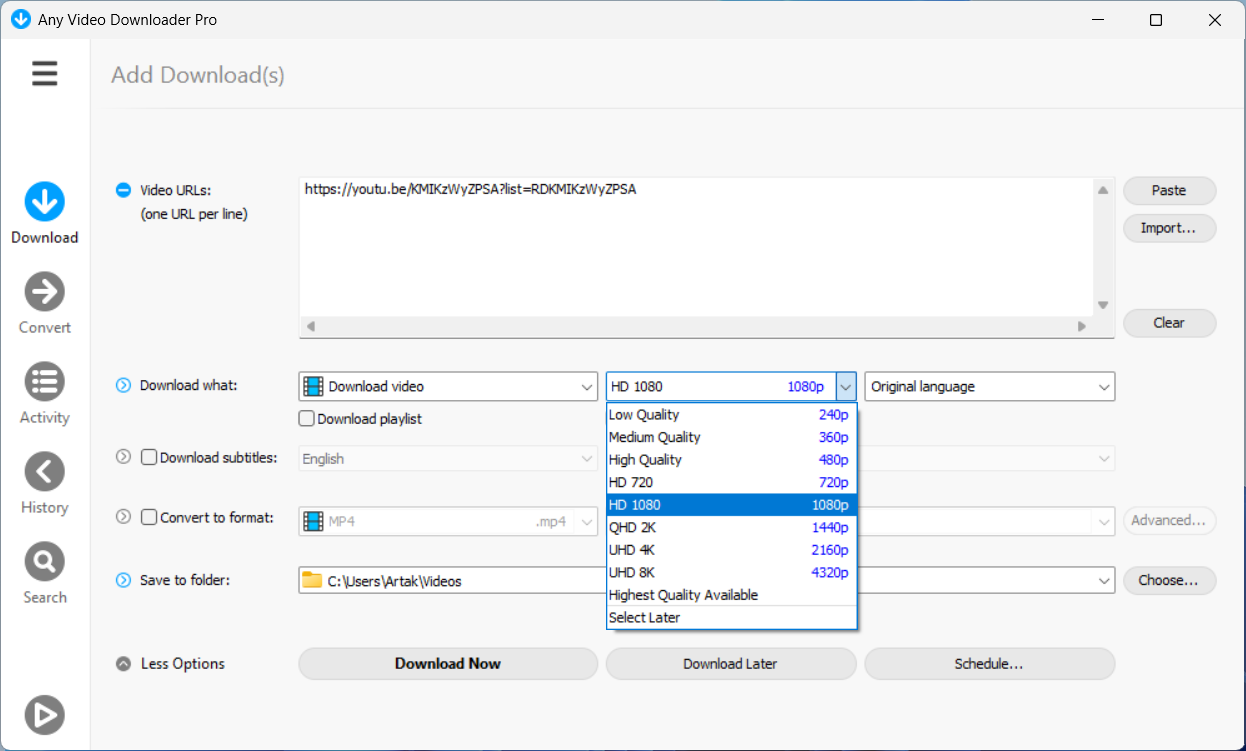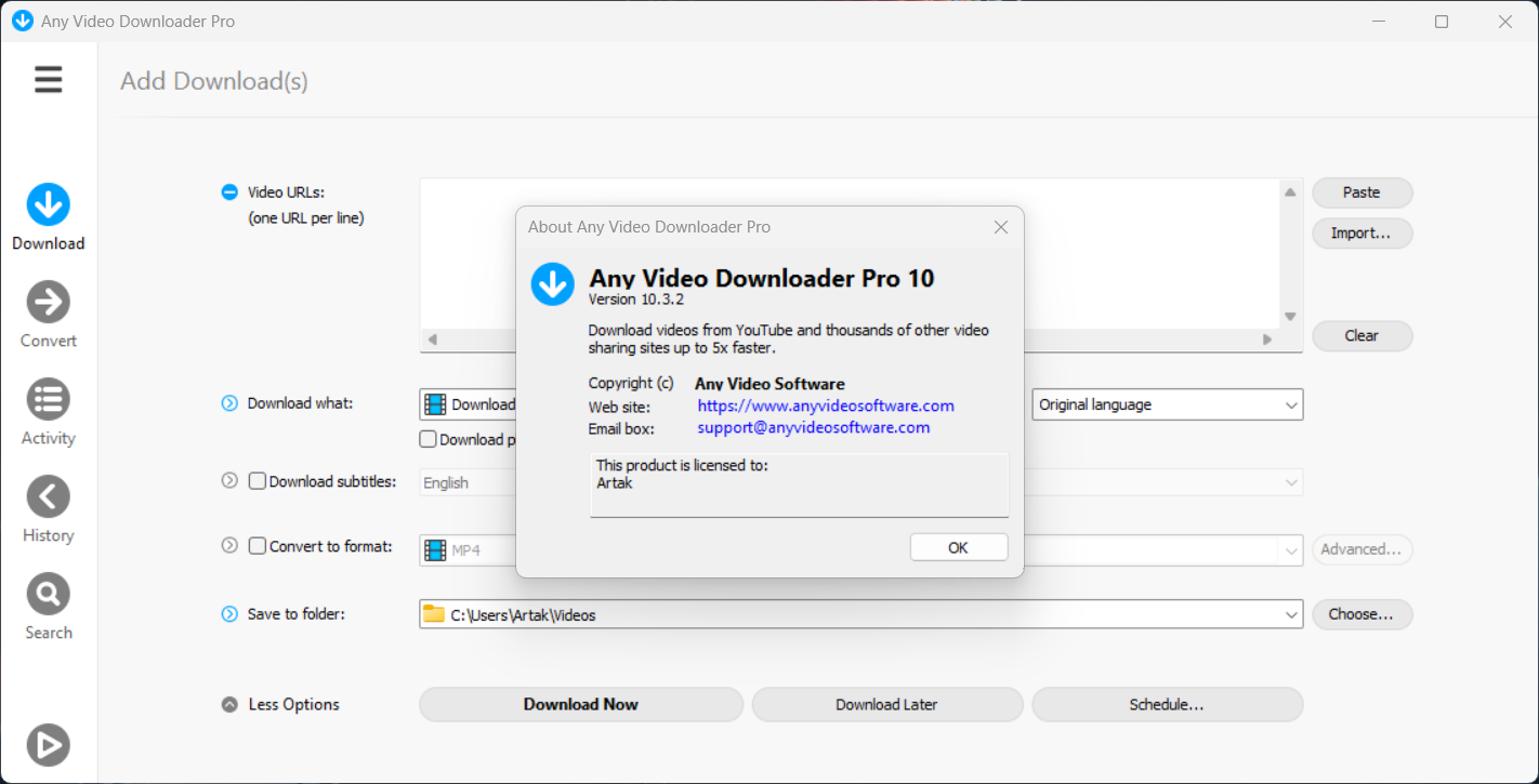 Описание: Any Video Downloader Pro - это приложение для Windows, помогающее скачивать видео с YouTube, Facebook, TikTok и тысяч других видеохостингов. Оно ускоряет загрузку до 5 раз. В программе есть возможность конвертировать видео и плеер для их просмотра.