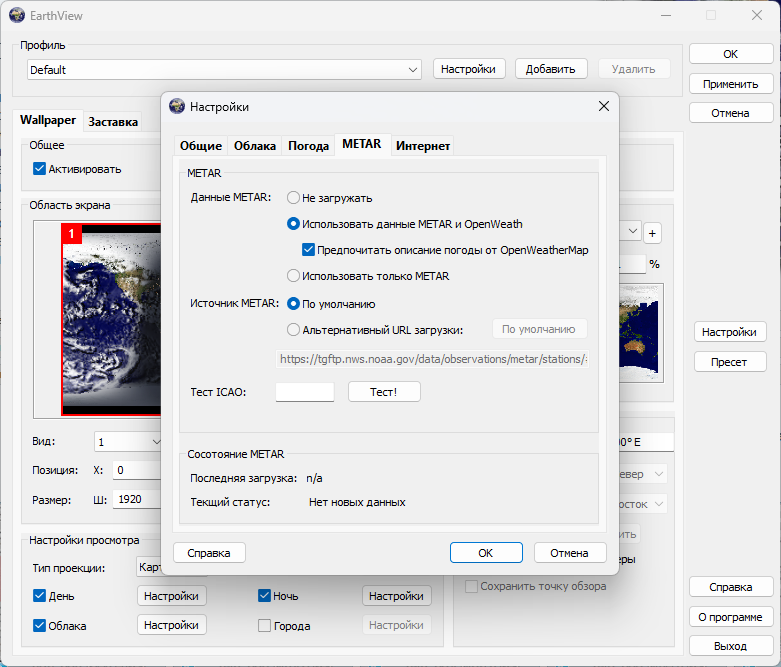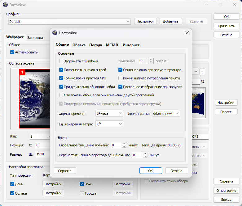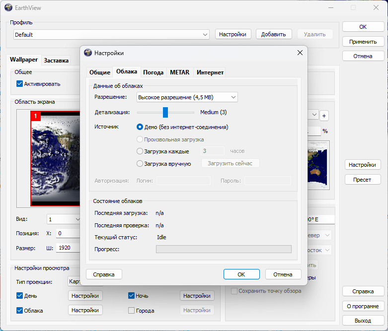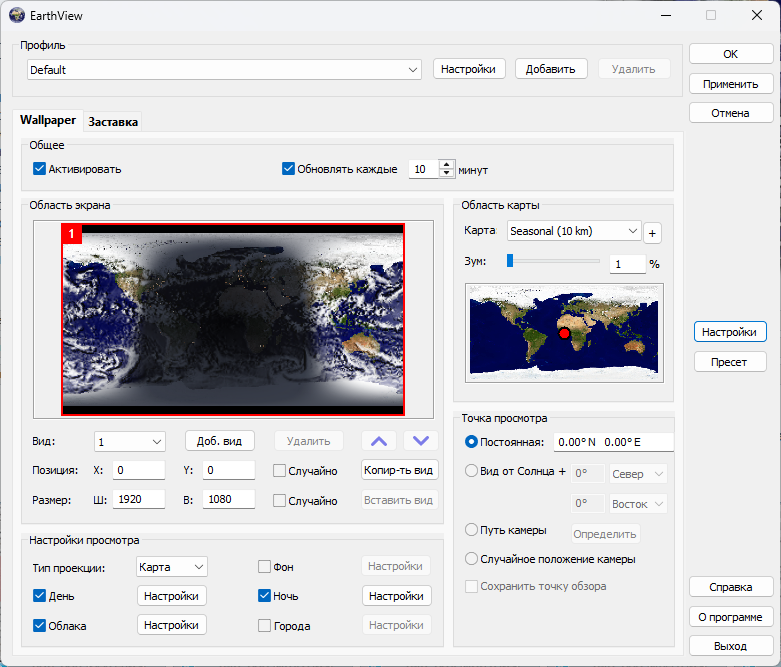 Описание: EarthView — это динамические обои для рабочего стола и хранитель экрана, которые отображают прекрасные виды земли с дневным светом и ночными тенями. Он создает красочные, высококачественные изображения с высоким разрешением для любого разрешения экрана — даже выше 3840x2160! Программа поддерживает виды карты и земного шара, городские районы, городские огни, атмосферные эффекты, облака, информацию о погоде, отображение местного времени и многое другое. EarthView поддерживает различные карты, по-разному отображающие нашу планету Земля, включая сезонные изменения растительности, снежного покрова и океанского льда. Многие опции позволяют полностью настроить все параметры просмотра. EarthView получил бесчисленное количество наград за абсолютно захватывающие изображения. EarthView поддерживает пять различных красивых карт Земли, начиная с разрешения 10 км, что означает, что при уровне масштабирования 100% 1 пиксель на вашем экране равен 10 километрам на Земле.