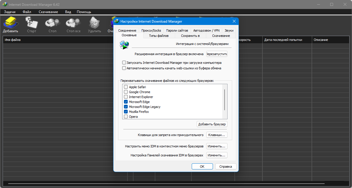 Для Internet Explorer: - При установке выбрать опцию "Запускать модуль контроля IE-браузеров" - Включить при запросе надстройку IDM integration (может потребоваться разовый перезапуск браузера, если после клика по ссылке IDM не перехватит закачку).