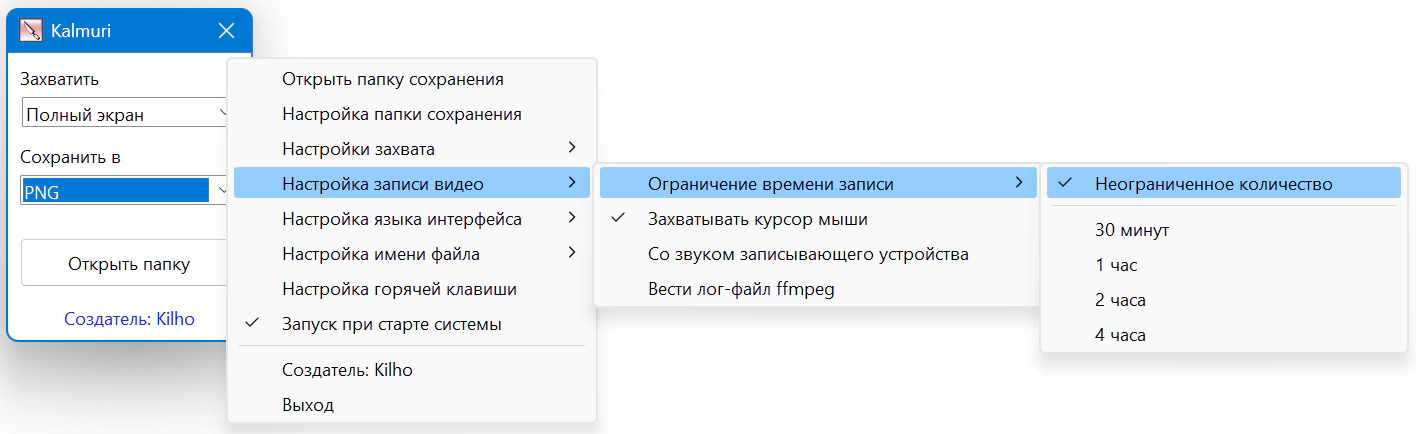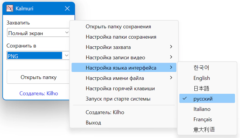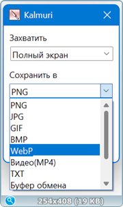 Описание: Kalmuri - это удобный инструмент для захвата экрана с минимальным набором опций. В качестве форматов доступны PNG, JPG, GIF, BMP и MP4. Kalmuri не имеет встроенного редактора изображений, но зато полностью бесплатен. Им можно пользоваться как дома, так и на работе и в образовательных учреждениях.