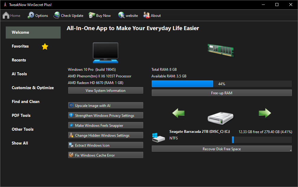 Описание: TweakNow WinSecret Plus! - позволяет пользователям исследовать скрытые настройки в Windows 10/11. Приложение группирует множество настроек реестра и предлагает их с помощью простого и удобного пользовательского интерфейса.