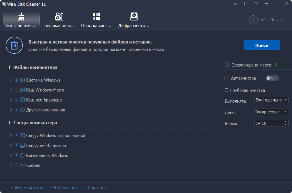 Wise Disk Cleaner – Быстрая, удобная и простая в использовании утилита для очистки жестких дисков от ненужных, временных и неиспользуемых файлов. Определяет более 50 типов мусорных файлов, а также можно самостоятельно добавлять новые форматы. После сканирования системы на наличие нежелательных файлов можно просмотреть подробную информацию о каждом и самостоятельно решить, что удалять.